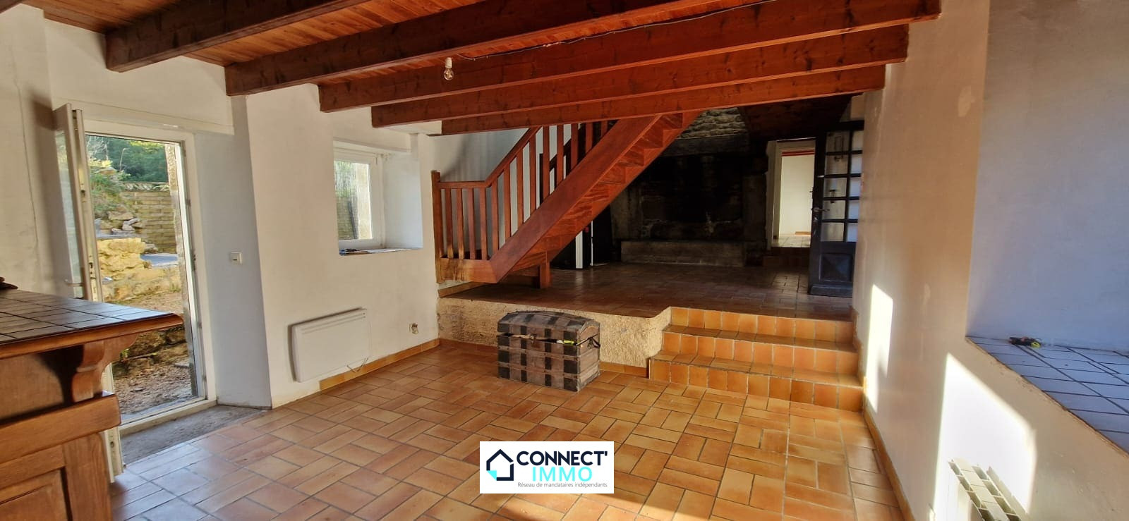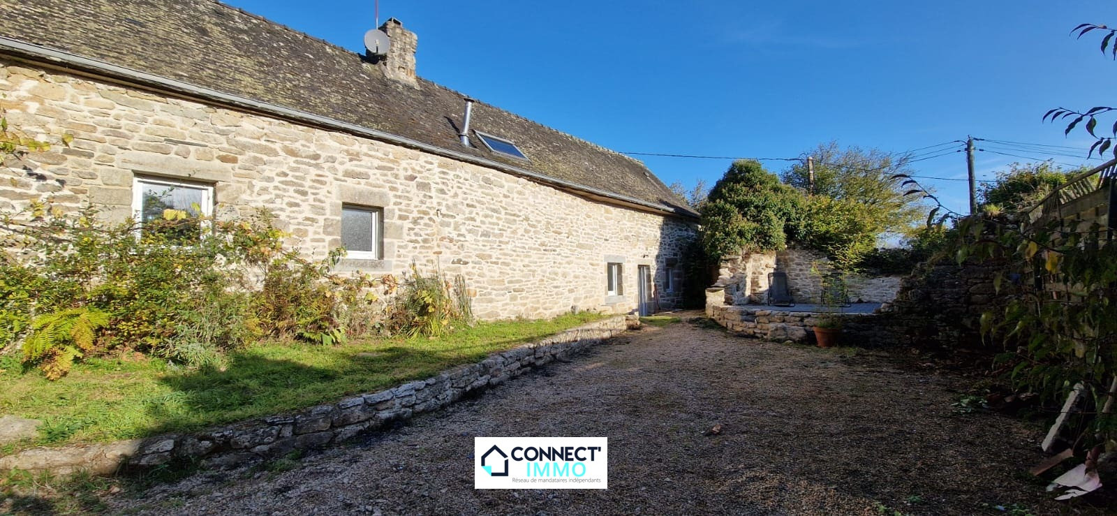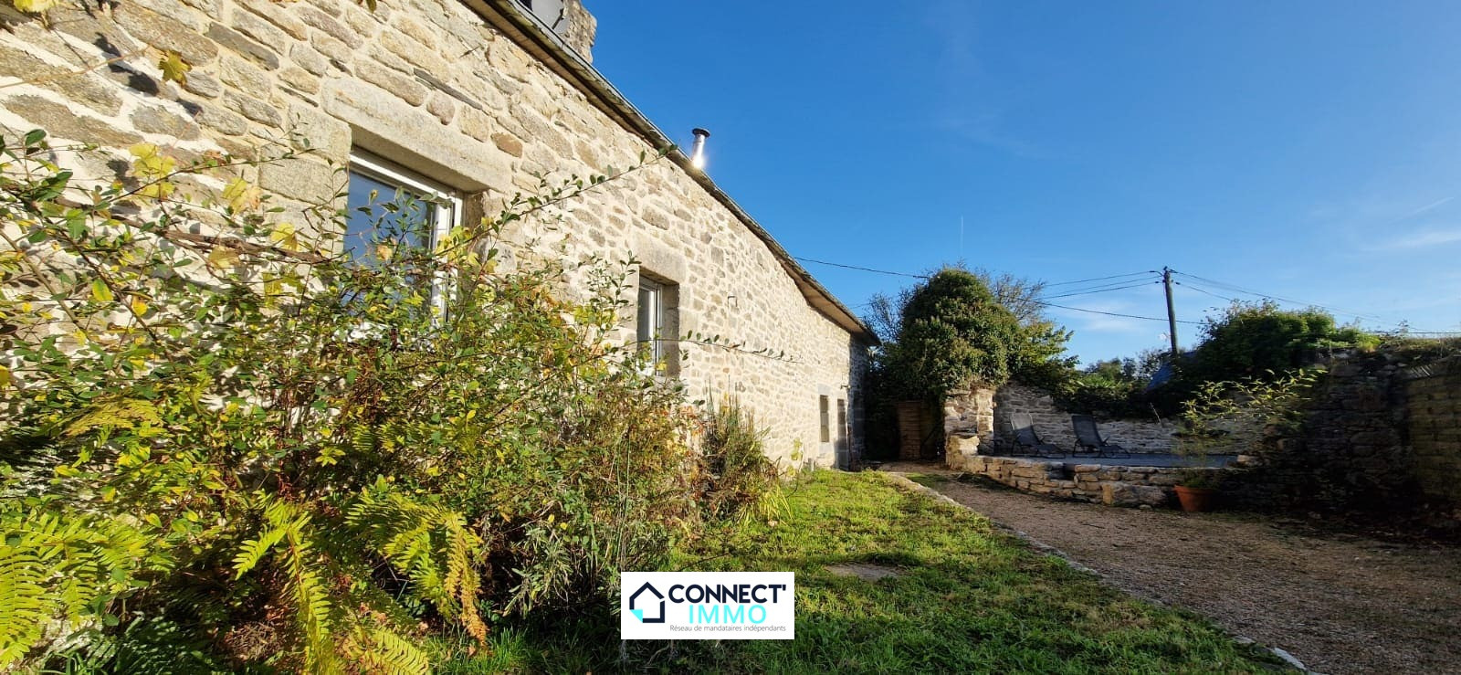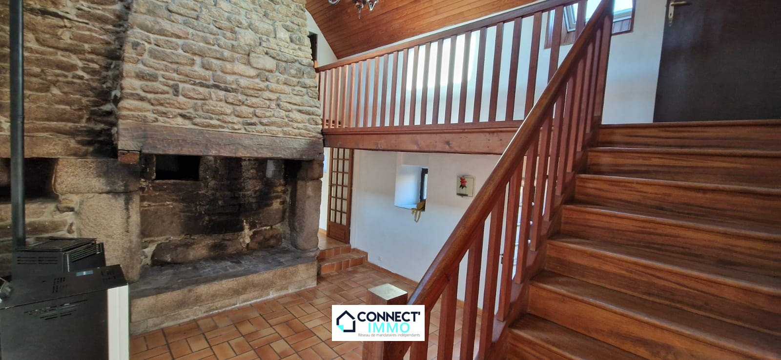 Connect'IMMO à BERRIEN. Sur une parcelle de 1178m² environ, charmante LONGÈRE en pierre proposant une belle pièce de vie déplafonnée avec cuisine ouverte sur espace salle à manger et séjour avec une CHEMINÉE d'origine et son POÊLE A PELLETS neuf. Toujours à ce niveau et pour une HABITABILITÉ DE PLAIN PIED, une chambre avec porte fenêtre, un WC et une SDB.