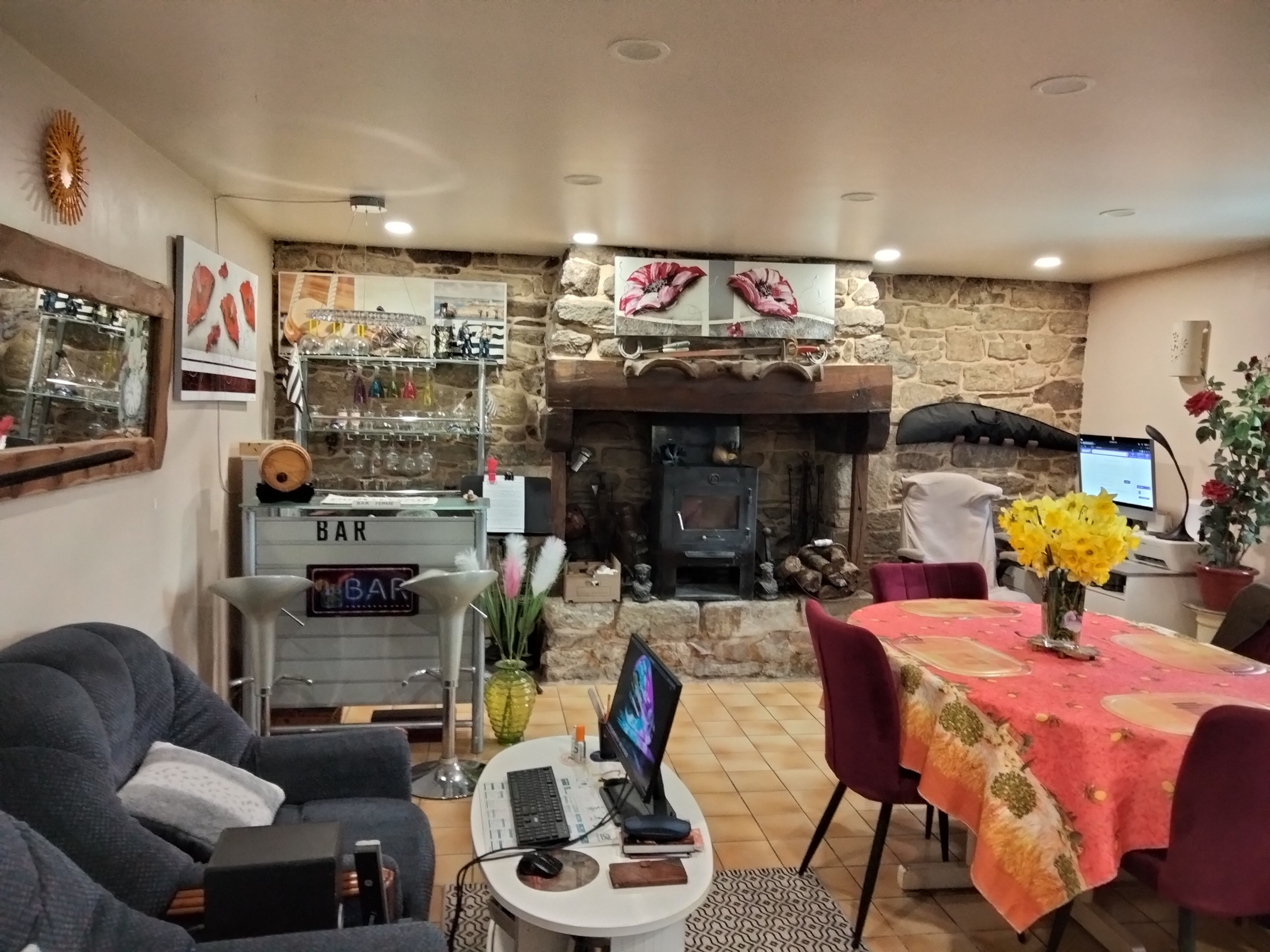 -Au RDC : pièce principale (cuisine aménagée et équipée / salon / salle à manger) avec POÊLE à bois, véranda, couloir/dégagement, chambre avec placard, SDB (avec baignoire balnéo + douche), WC pour une HABITABILITÉ possible DE PLAIN PIED.